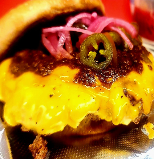 Our Cheeseburger topped with house-made meat sauce, cheddar cheese, pickled red onion, and pickled jalapenos.
